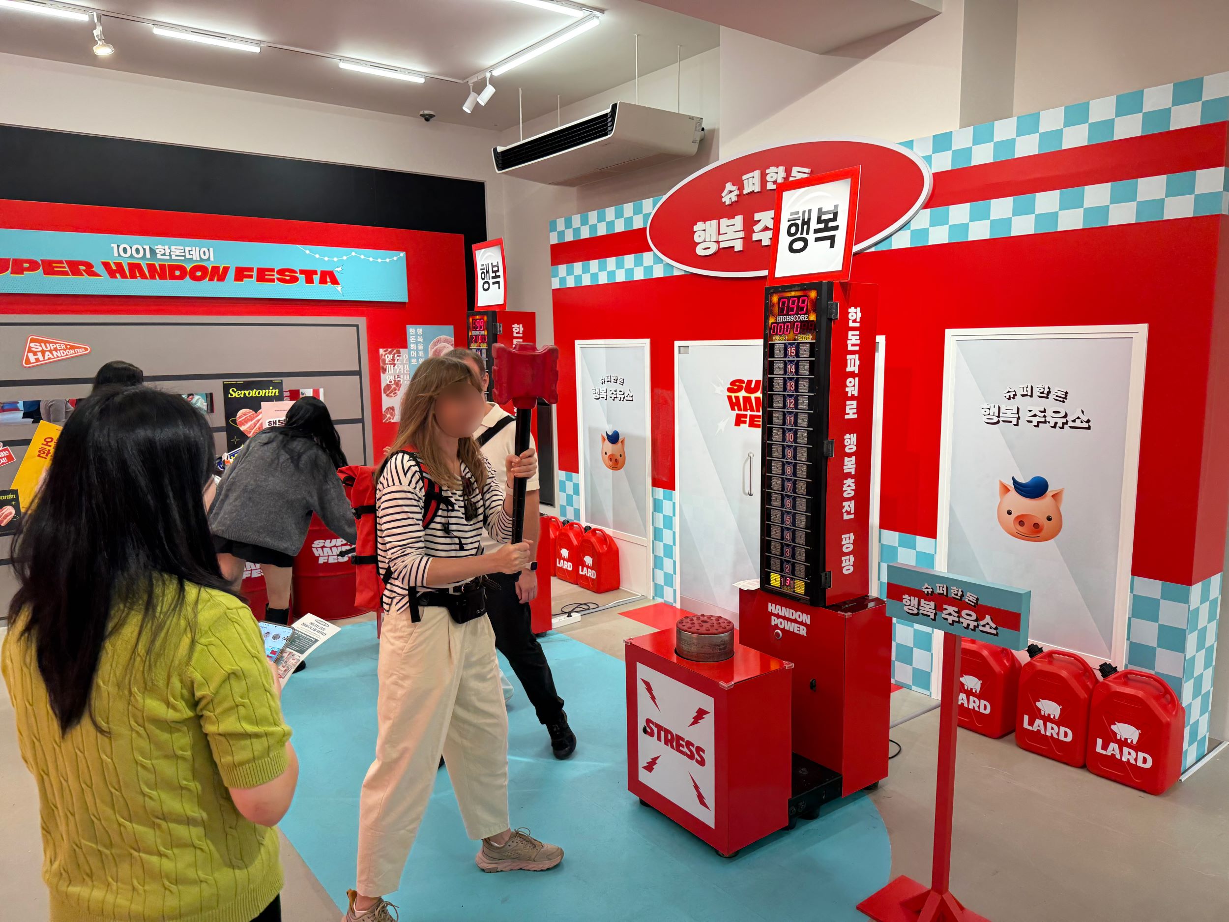 이번 팝업스토어에서 다양한 체험이 이뤄지는 ‘슈퍼 한돈 에너지 타운’에서는 ▲단백질 보충 정육점(안심 단백질 함량 맞추기) ▲슈퍼푸드 라드유 서점(라드유 정보 퀴즈) ▲행복충전 주유소(트립토판 해머 타격 게임) ▲한돈 신선 마트(스텝퍼 신선도 비교) 등 네 가지 체험존이 운영됐다. 방문객들은 미션 완수 후 한돈 굿즈(리유저블백, 텀블러, 장바구니 등)를 받으며 체험형 프로그램에 큰 만족감을 드러냈다.